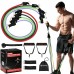 Довжина кожного еспандера – 128 см. Основа – трубка з високоякісного латексу, з обох боків якої розташовані металеві карабіни. До карабінів можна кріпити ручки, щоб навантажувати верхню частину тіла або манжети на липучках для опрацювання нижньої частини тіла. Для статичних вправ передбачено дверний анкер, що дозволить зафіксувати одну сторону еспандера. У комплект входить 5 еспандерів з різною силою навантаження: 4.5 кг - Ø 0.8 см, 9.1 кг - Ø 0.9 см, 13.6 кг - Ø 1 см, 18.1 кг - Ø 1.1 см, 22.7 кг - Ø 1.2 см. Одночасно можна приєднувати два більше еспандерів, сумарне навантаження може сягати 68 кг. Весь набір зберігається у компактному футлярі, таким чином у вас завжди під рукою буде свій переносний спортивний зал.