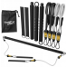 - У набір входять резинки: 2 резинки по 14кг, 2 резинки по 23кг, 2 ремінці на щиколотки, складна з 3 частин палиця, сумка для зберігання.
